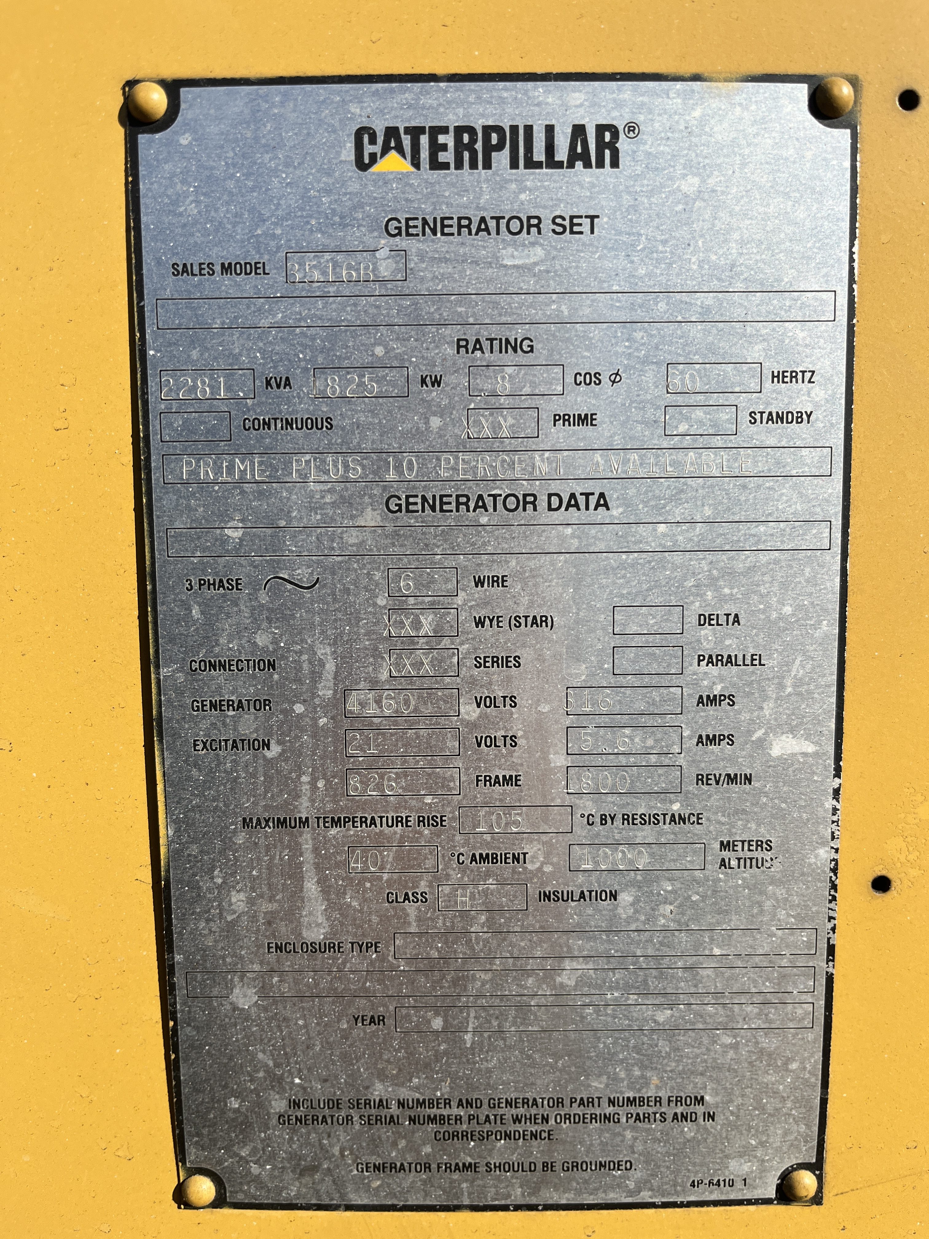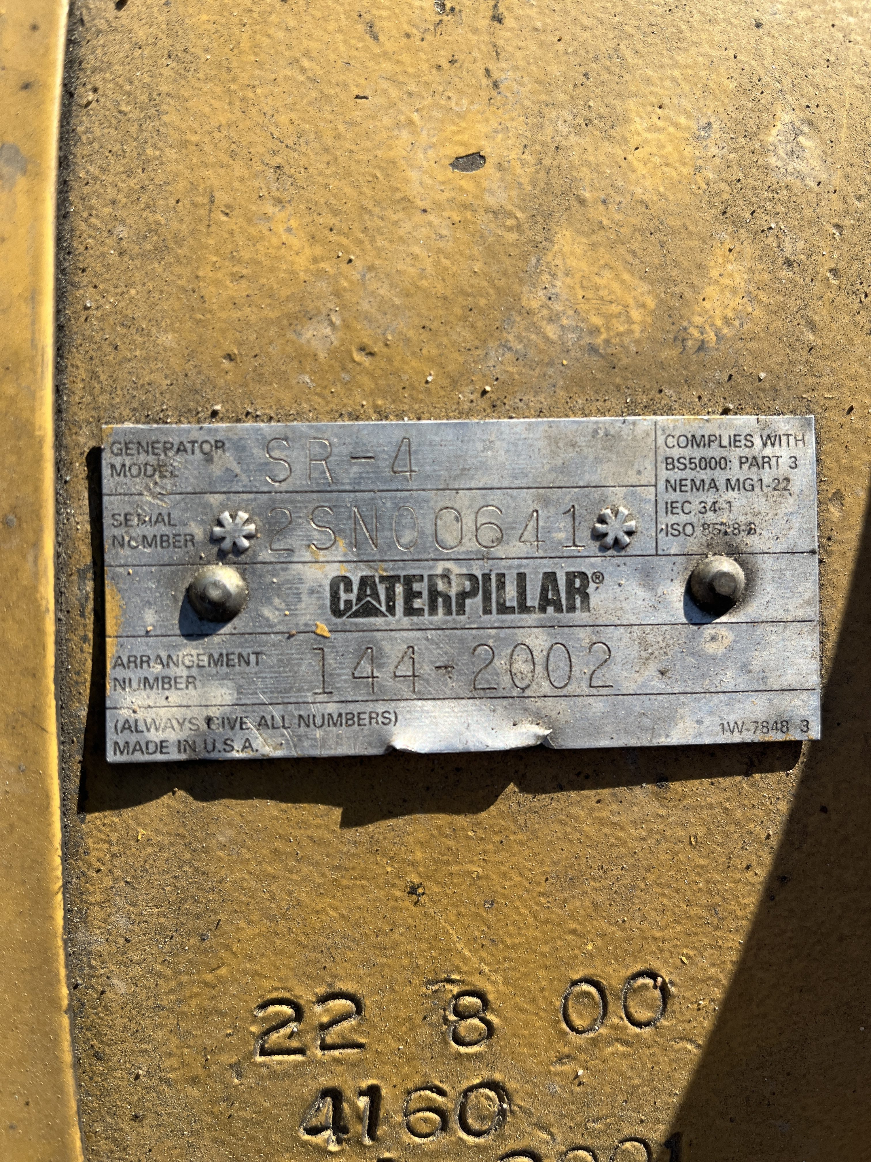 - DESCRIPTION: 2000 Caterpillar SR-4 Generator End Serial# 2SN00641, Arrangement# 144-2002, 2000kW Standby/1825kW Prime, 4160V (6-wire), 60Hz, 0.8pf, 1800RPM, 826 frame, 21 flywheel, Dual-bearing, 00 housing, 0.667 pitch, PMG, 2,962 Original hrs., Good Running Condition, Standby Take-off. Generator-End Only, No Engine, Recently Removed from a 3516B.