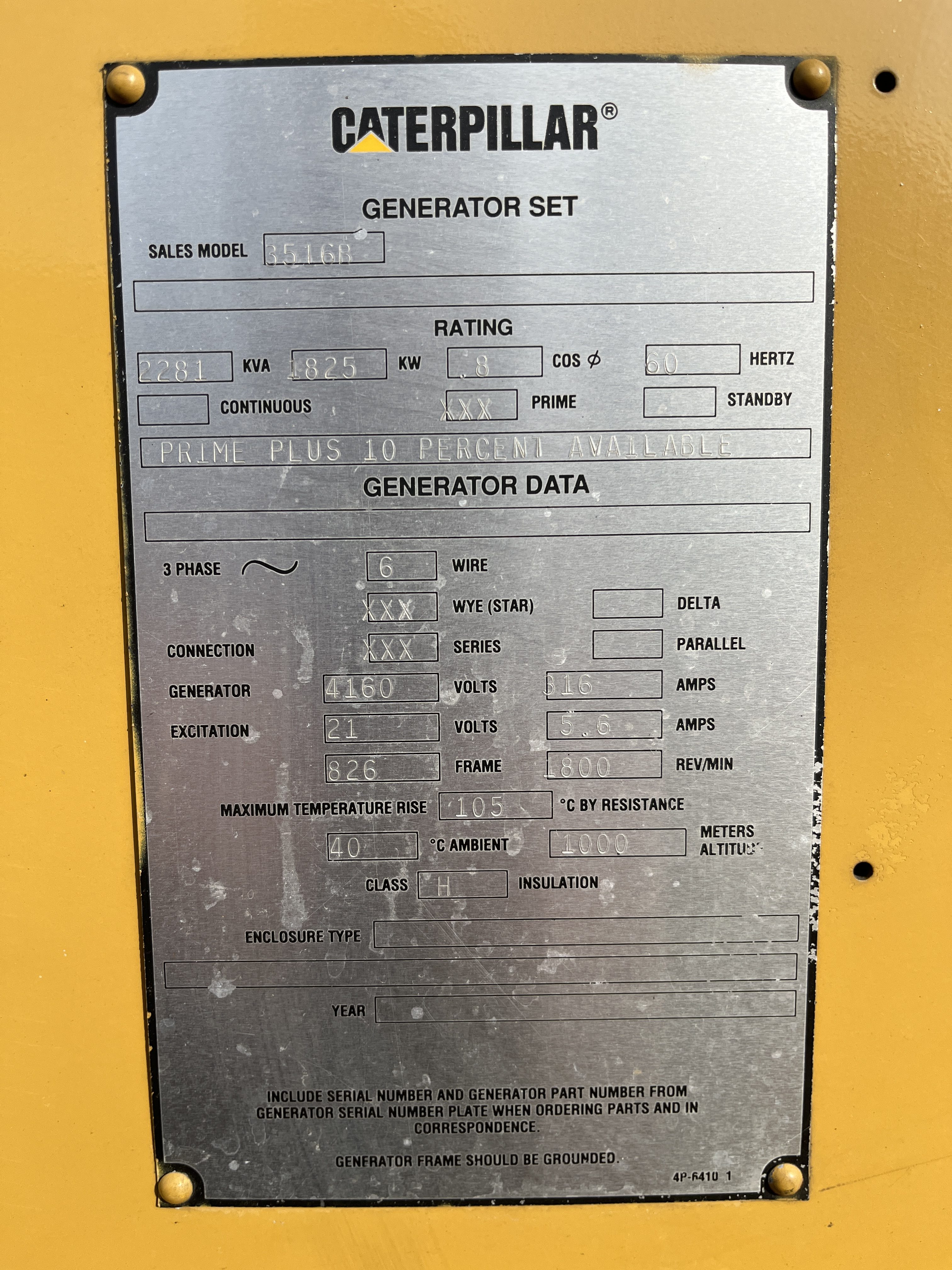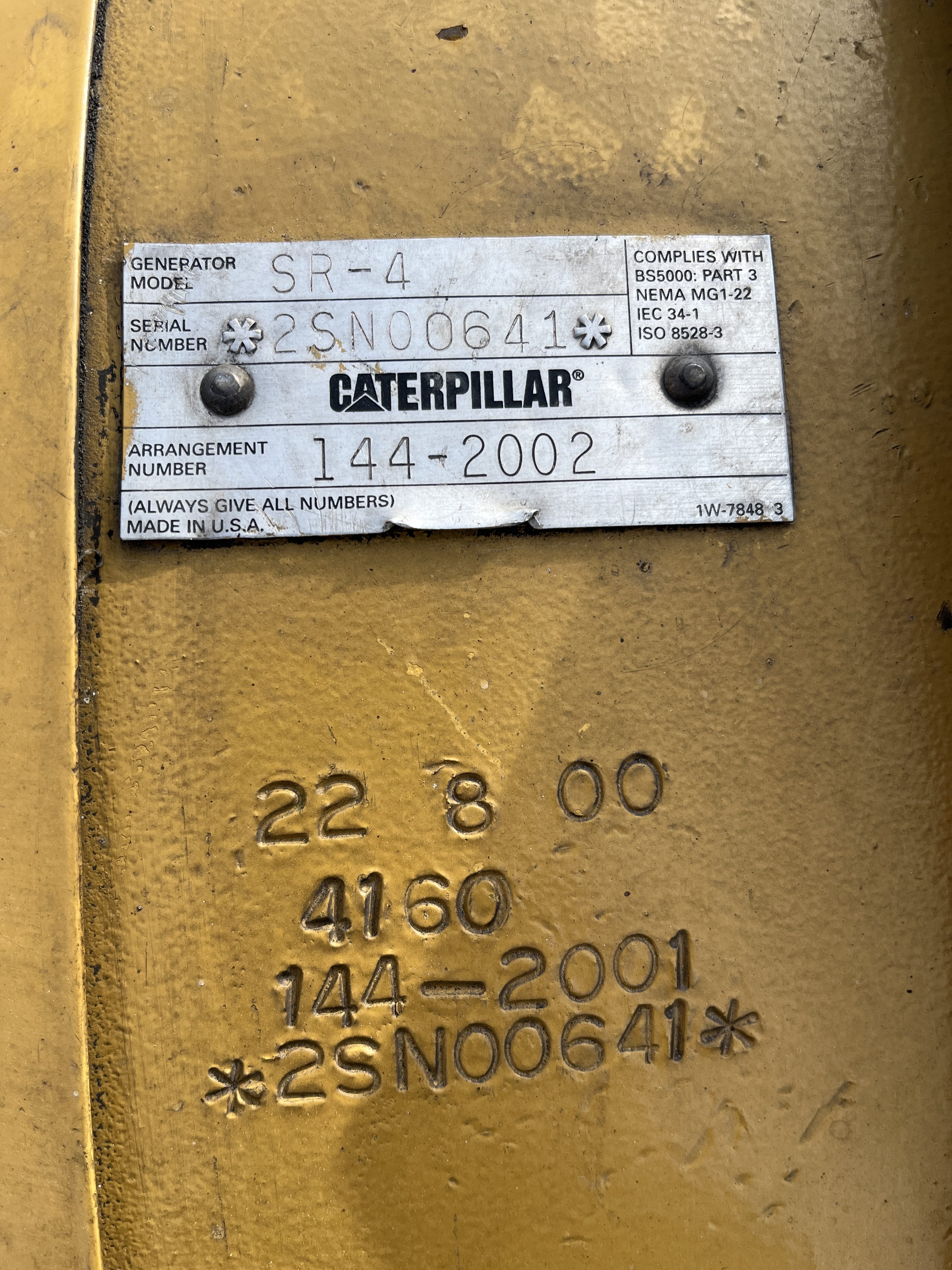 - DESCRIPTION: 2000 Caterpillar SR-4 Generator End Serial# 2SN00641, Arrangement# 144-2002, 2000kW Standby/1825kW Prime, 4160V (6-wire), 60Hz, 0.8pf, 1800RPM, 826 frame, 21 flywheel, Dual-bearing, 00 housing, 0.667 pitch, PMG, 2,962 Original hrs., Good Running Condition, Standby Take-off. Generator-End Only, No Engine, Recently Removed from a 3516B.