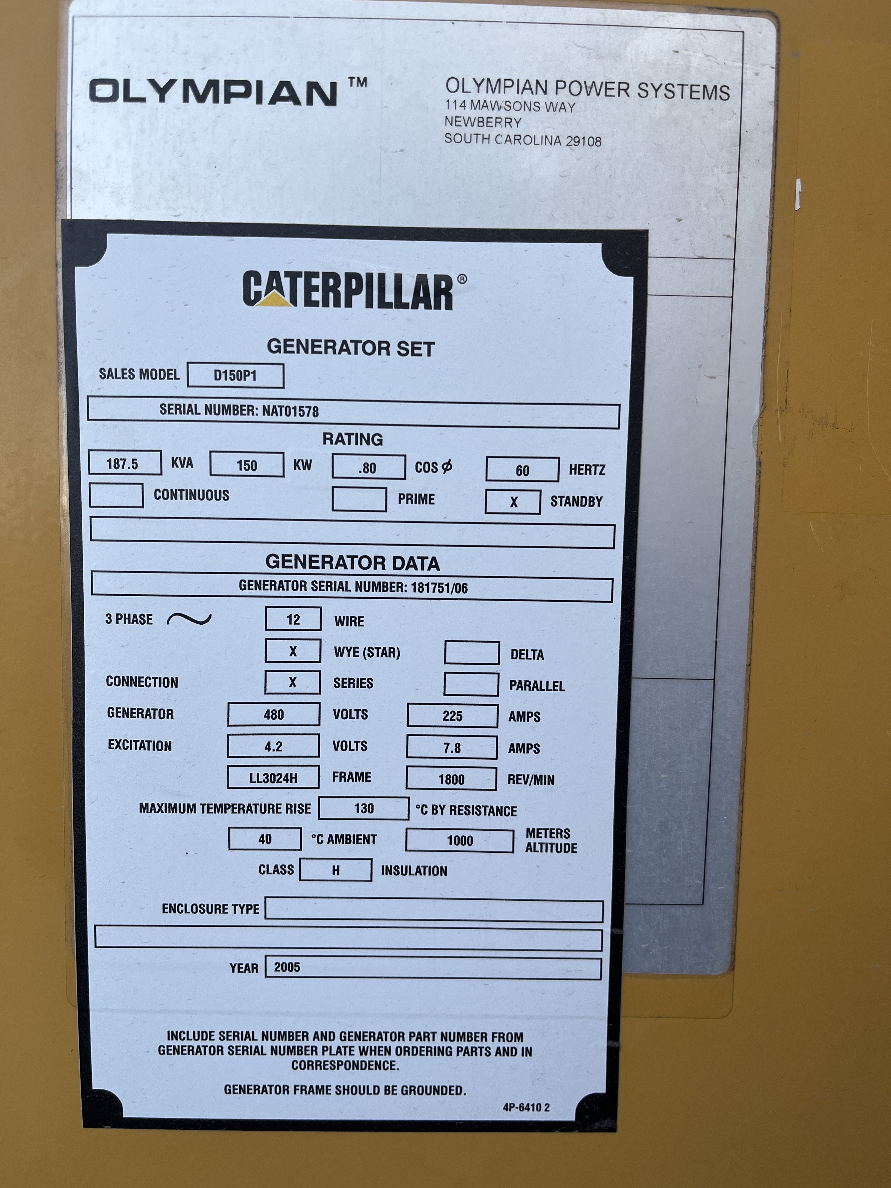 - DESCRIPTION: 2005 Olympian D150P1 Generator Set S#NAT01578, 150kW Standby/135kW Prime, 277/480V (12-Wire Reconnectable), 3PH, 60Hz, 1800RPM, 538 Hours, Perkins 6 Cylinder Diesel Engine, Electronic Governor, Engine-Mounted Radiator, Heavy-Duty Air Cleaner, Jacket Water Heater, 12V Electric Starter, Auto-Start/E-Stop, Analog Control Panel, 600A Circuit Breaker, Weatherproof Enclosure Upon a 300 Gallon Fuel Tank. SERVICE WORK: Generator Set Will Be Serviced and Load Tested to 100% Capacity. DIMENSIONS: L – 116" W – 44" H – 96" Weight: 5,500lbs.