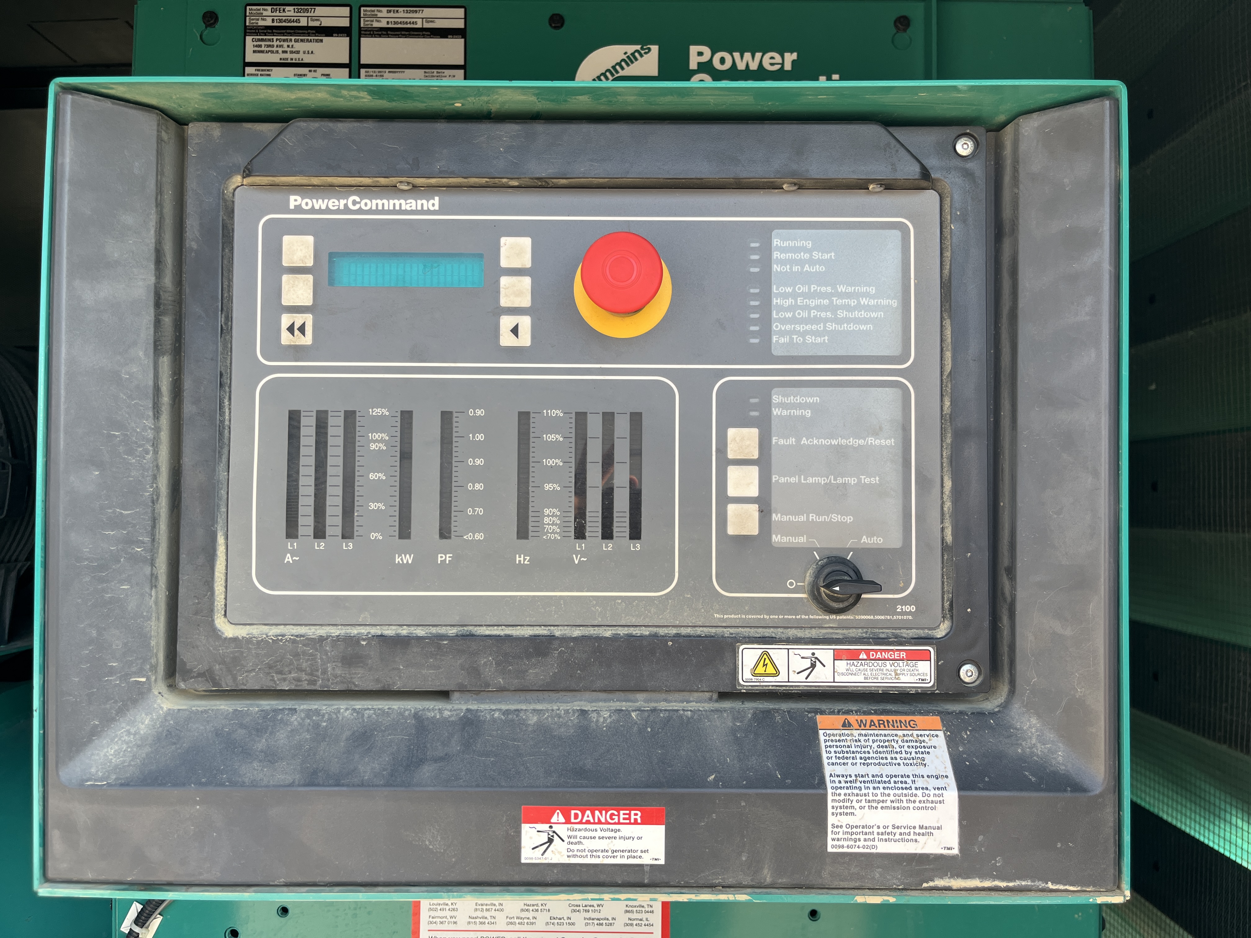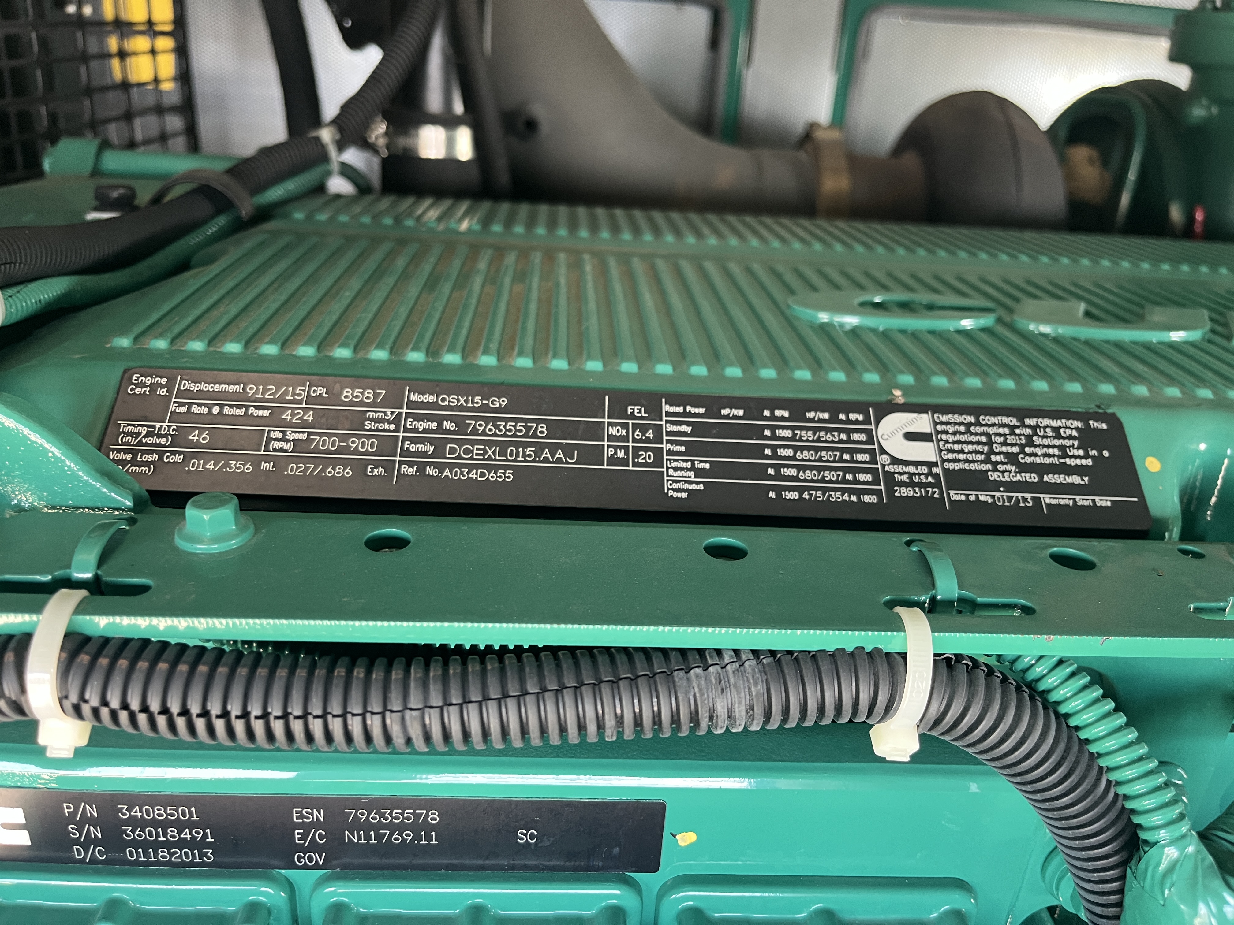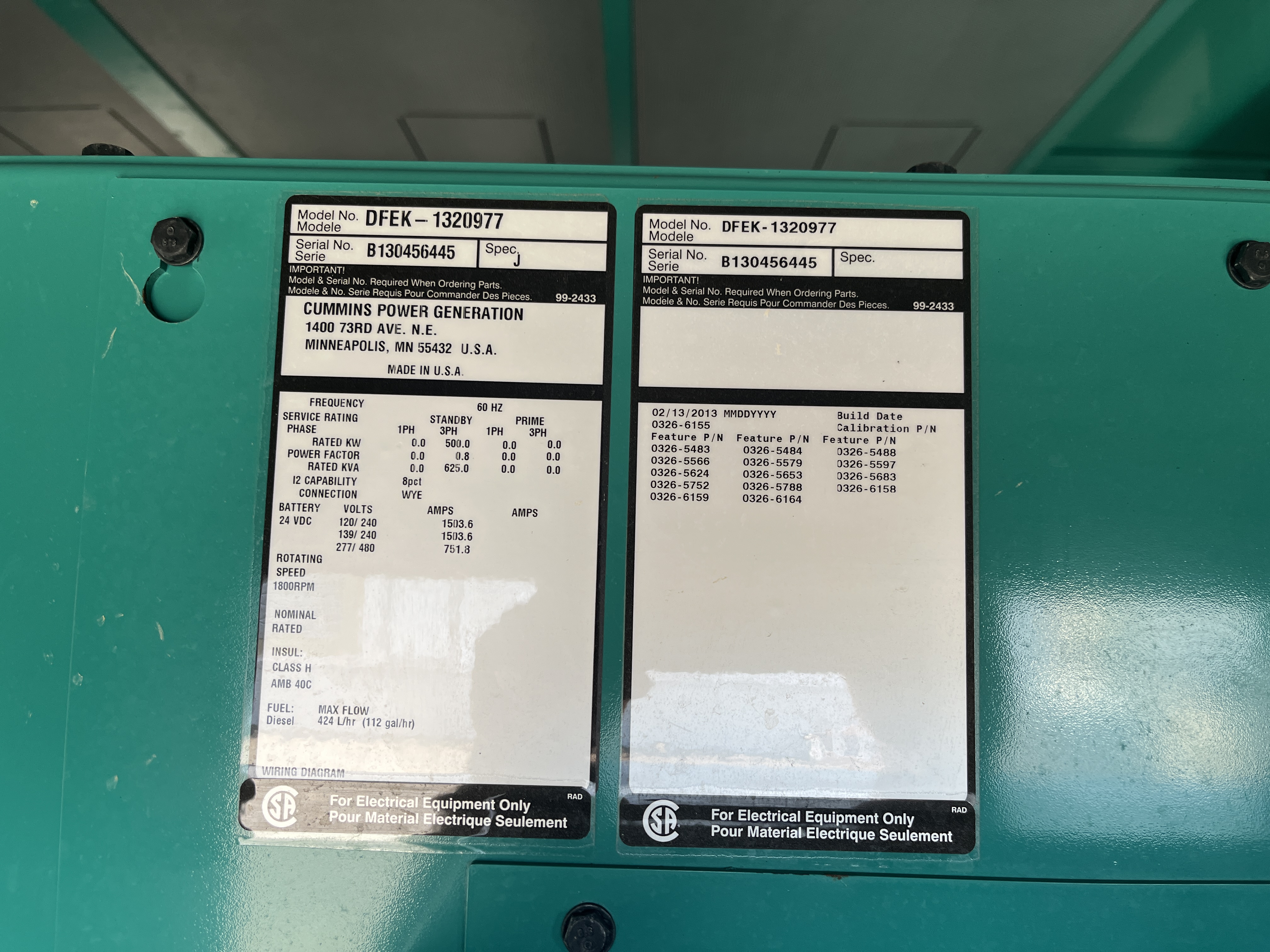 - DESCRIPTION: 2013 Cummins DFEK Generator Set S#B130456445, 500kW Standby/455kW Prime, 480V (12-Wire Reconnectable), 60Hz, 1800RPM, 236 Hours, Cummins QSX15-G9 Diesel Engine, Electronic Governor, Engine-Mounted Radiator, Air Cleaner, Jacket Water Heater, 24V Electronic Starter, 10A Battery Charger, Charging Alternator, Power Command Digital Control Panel, (1) 600A Circuit Breaker & (1) 400A Circuit Breaker, Sound-Attenuated Enclosure Upon 350-Gallon Sub-Base Fuel Tank, UL-2200 Listed Package. EPA Tier 2 Emissions Certified. SERVICE WORK: Generator Set Will Be Serviced and Load Tested to 100% Capacity. DIMENSIONS: L – 188” W – 86” H – 117” Weight: 17,000 lbs.