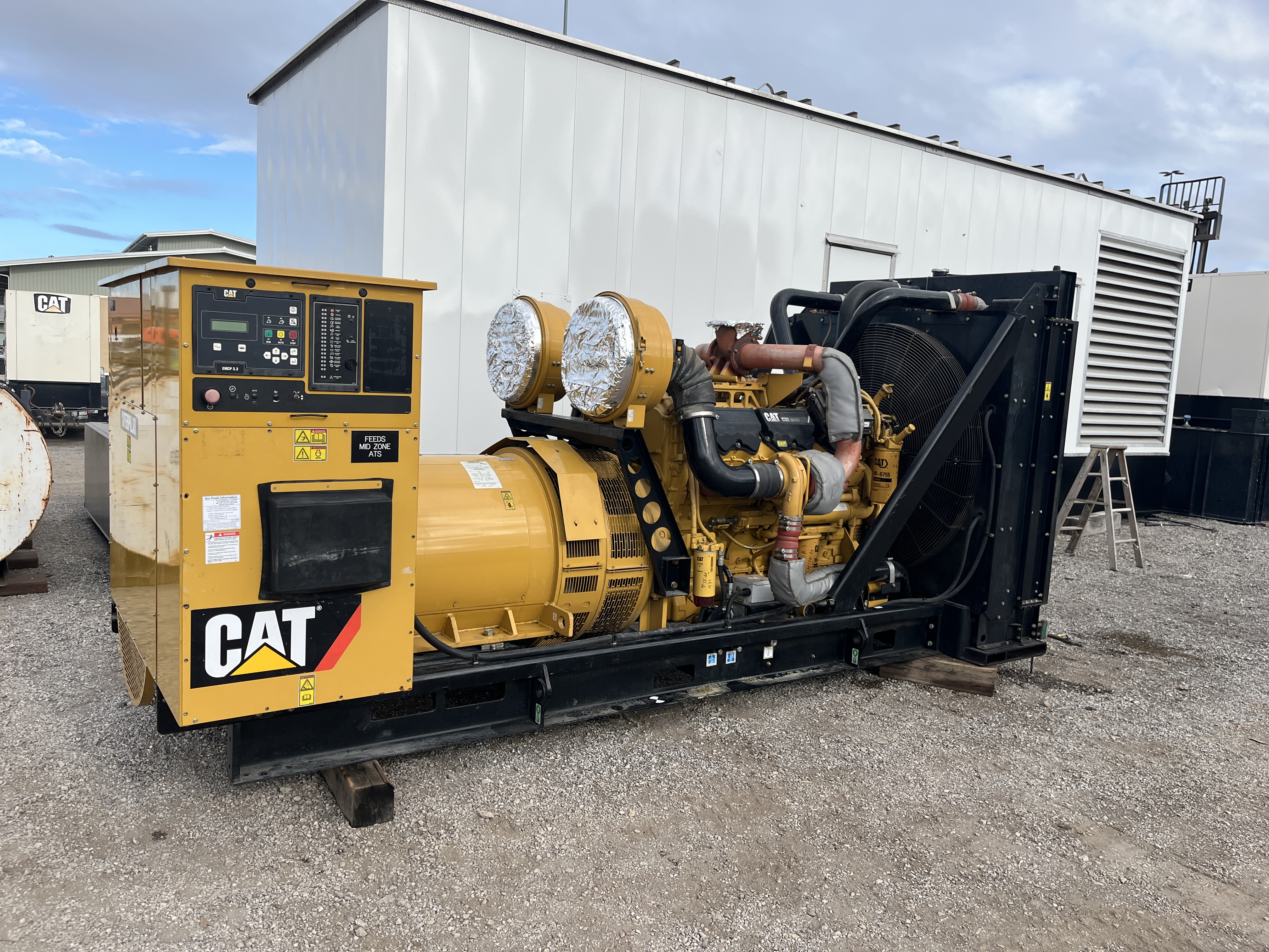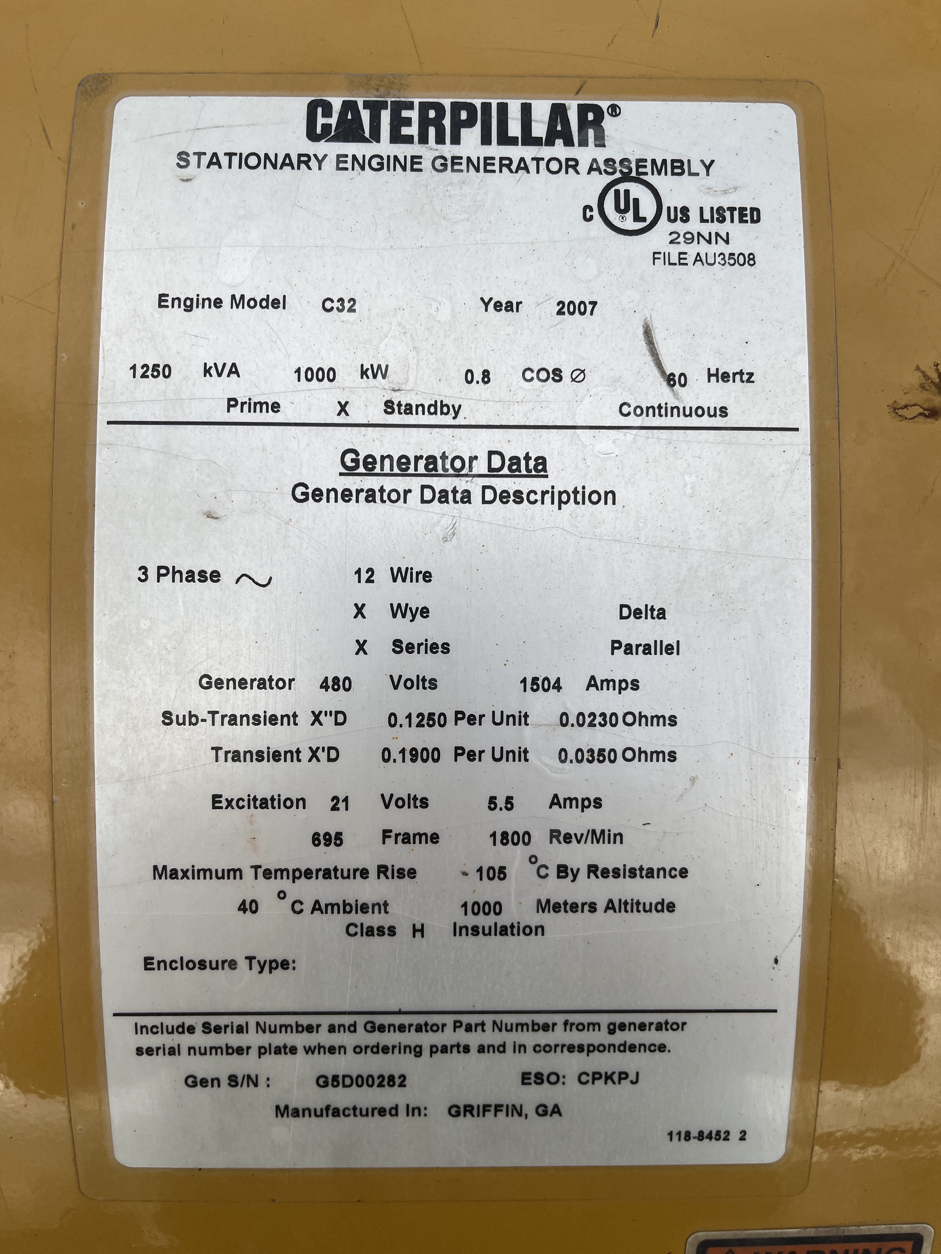 - DESCRIPTION: 2007 Caterpillar C32 Generator Set Serial# SXC01409, 1000kW Standby/910kW Prime, 480V (12-Wire Reconnectable), 60Hz, 1800RPM, 432 Hours, CAT C32 DITA Diesel Engine, Electronic Governor, Engine-Mounted Radiator, Dual Element Air Cleaners, 240VAC Jacket Water Heater, 24V Electronic Starter, 45A Charging Alternator, EMCP 3.3 Digital Control Panel, 1600A Main Circuit Breaker, Open-Skid; No Enclosure or Fuel Tank Included, EPA Tier 2 Stationary Emissions Compliant. SERVICE WORK: Generator Set Will Be Serviced and Load Tested to 100% Capacity. DIMENSIONS: L – 164” W – 67” H – 85” Weight: 20,000 lbs.