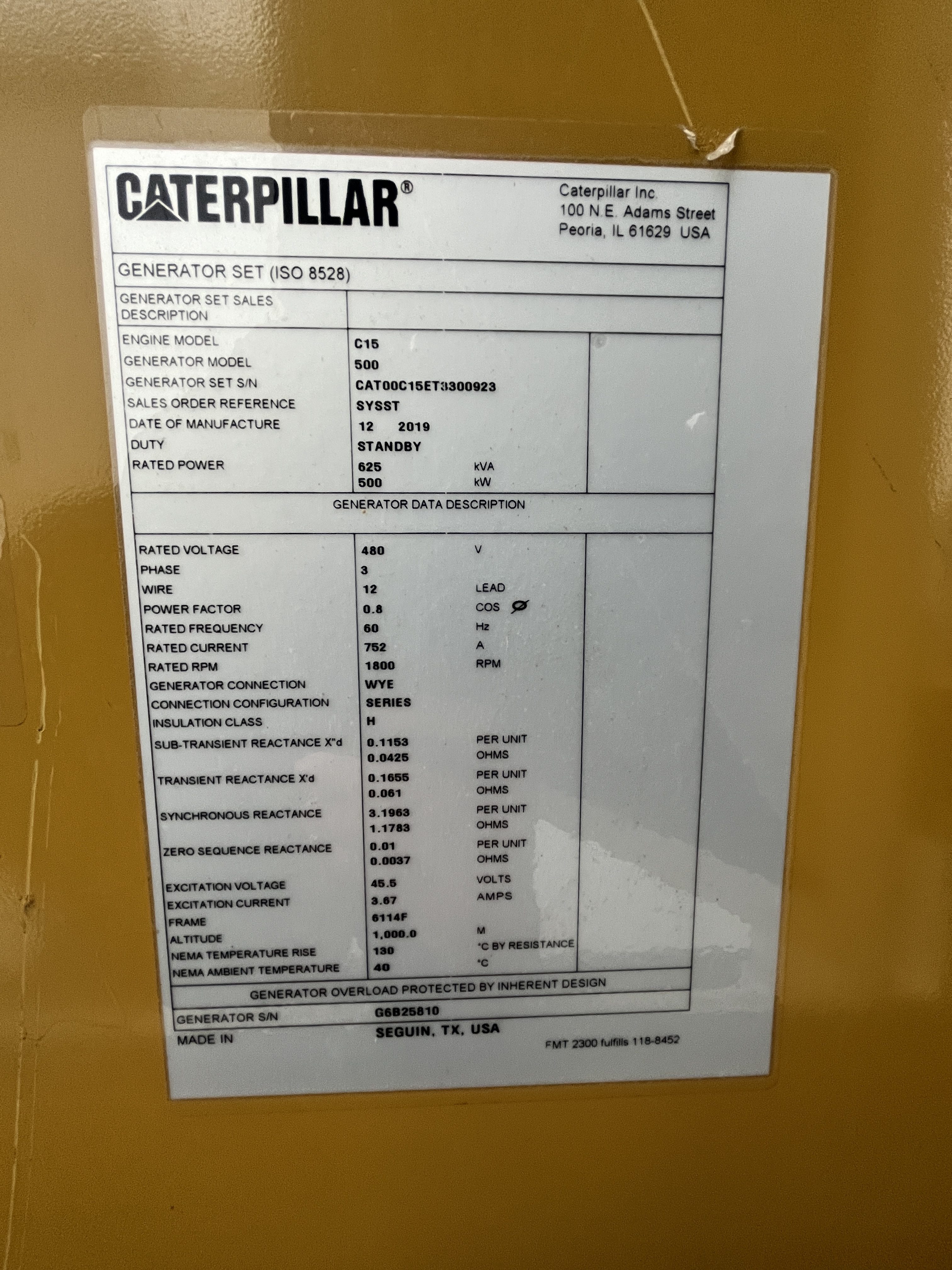 - DESCRIPTION: 2019 Caterpillar C15 Generator Set Serial# T3300923, 500kW Standby, 480V (12-Wire), 60Hz, 1800RPM, 99 Hours, CAT C15 Diesel Engine, EPA Tier 2 Emissions Rated, ADEMA4 Electronic Governor, Engine-Mounted Radiator, Air Cleaner, 240VAC Jacket Water Heater, 24VDC Electronic Starter, Charging Alternator, 10A Battery Charger, EMCP 4.2B Digital Control Panel W/NFPA-110 Annunciator, 800A Circuit Breaker Protection, Sound-Attenuated Enclosure Upon 2900-Gallon Sub-Base Fuel Tank, UL-2200 Listed Package. SERVICE WORK: Generator Set Will Be Serviced and Load Tested to 100% Capacity. DIMENSIONS: L – 226” W – 88” H – 142” Weight: 30,000 lbs.