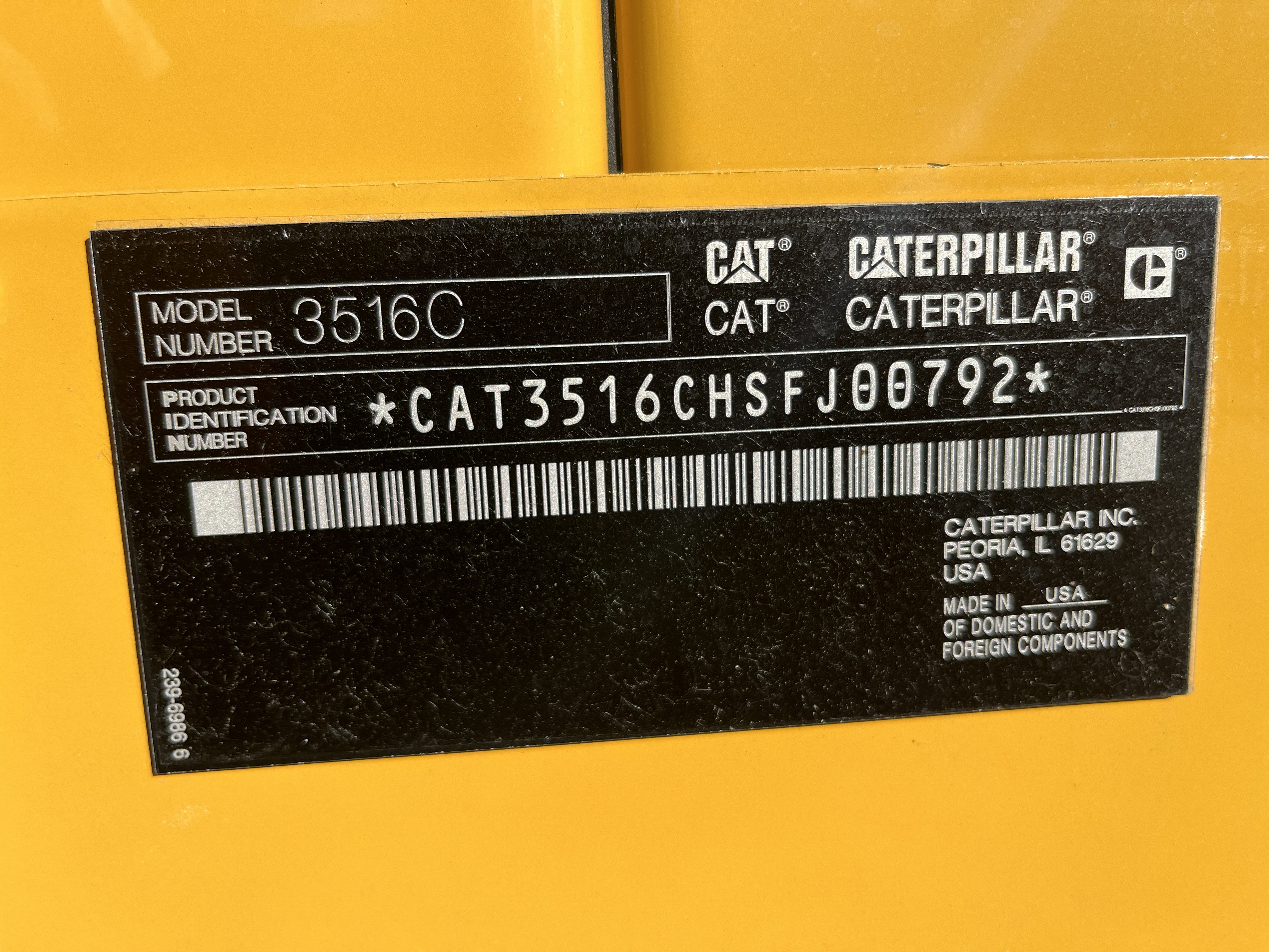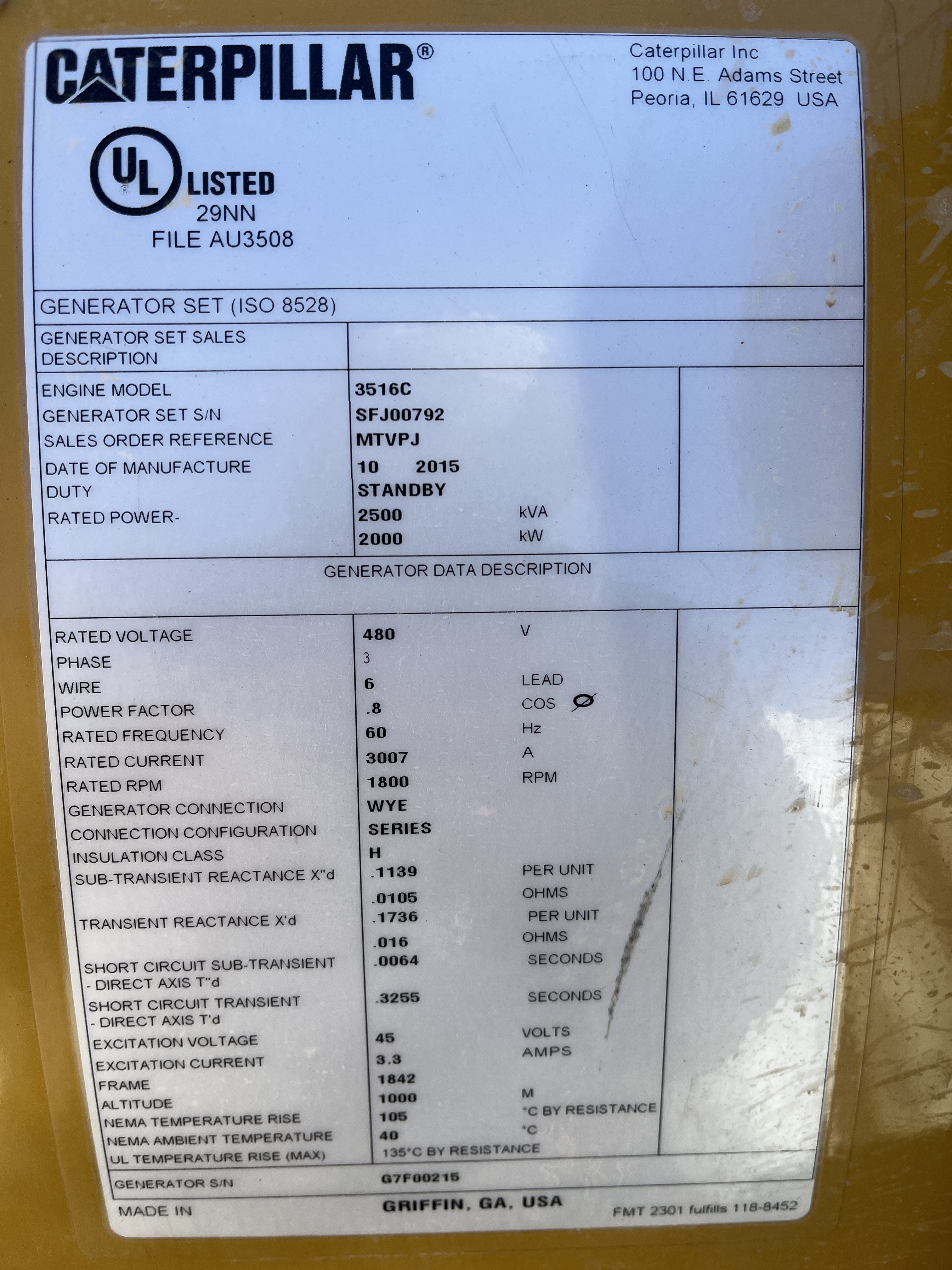 - DESCRIPTION: 2015 Caterpillar 3516C Generator Set Serial# SFJ00792, 2000kW Standby, 480V, 60Hz, 1800RPM, 291 Hours, CAT 3516C Diesel Engine, EPA Emergency Emissions Rated, ADEM3 Electronic Governor, Engine-Mounted Radiator, Dual Element Air Cleaners, 240VAC Jacket Water Heater, Dual Heavy Duty 24VDC Electronic Starters, 45A Charging Alternator, EMCP 4.2 Digital Control Panel W/NFPA-110 Annunciator, Circuit Breaker Protection, Open-Skid; No Enclosure of Fuel Tank Included. UL-2200 Listed Package. SERVICE WORK: Generator Set Will Be Serviced and Load Tested to 100% Capacity. DIMENSIONS: L – 275” W – 94” H – 118” Weight: 45,000 lbs.